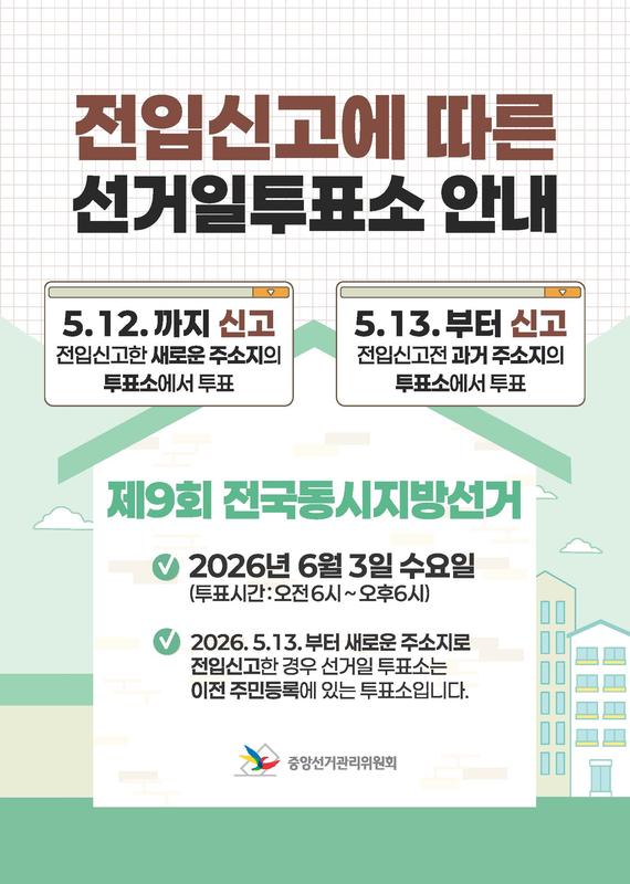 2026. 6. 3. 제9회 전국동시지방선거와 관련하여, 선거인명부작성기준일(5. 12.) 전후 전입신고하는 경우 전입신고일에 따라 선거일투표소가 달라질 수 있으니 유의하시기 바랍니다.