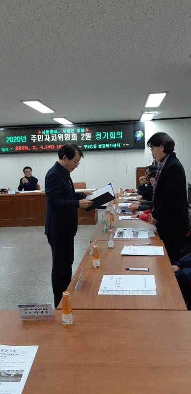 - 회의내용 : 무료법률 홍보 활성화 방안 논의, 동정소식 전달, 주민자치 프로그램 운영현황 보고, 1월 주민자치위원 주요활동 보고, 위촉장 전달 등