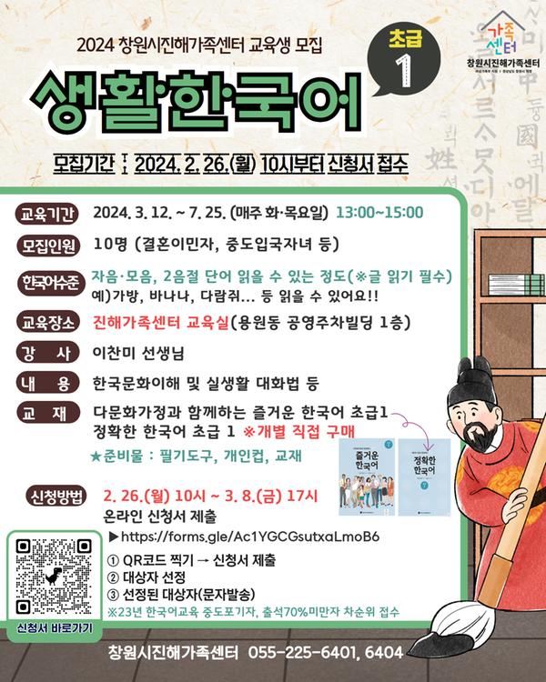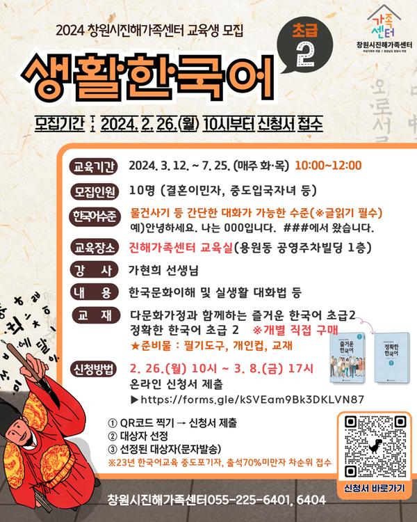 창원시(진해)가족센터에서는 다문화가족의 역량강화를 위해 다음과 같이『한국어교육 과정』을 개설하오니 많은 참여 부탁드립니다.