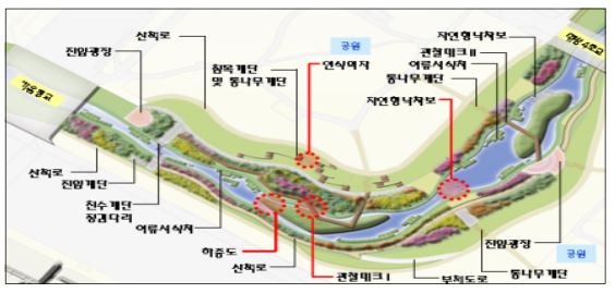 - 생물서식처 및 생태이동로 확보, 경관 및 친수시설 설치