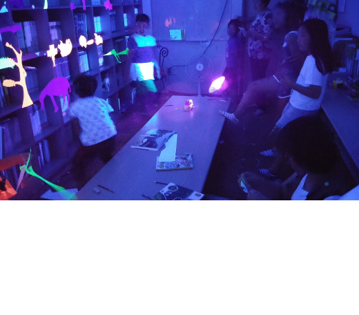 블랙라이트 인형극 “바닷속 풍경”을 주제로 형광종이, 형광펜등을 이용하여 그리기, 만들기, 찢기, 붙이기를 통한 평면, 입체, 색체(조형요소)를 체험하고 친구들에게 자신이 만든 작품을 선전하며 역할에 대한 이해를 돕고 재료의 사용법과 빛의 반응 등을 연구하고 만들어 보는 시간.