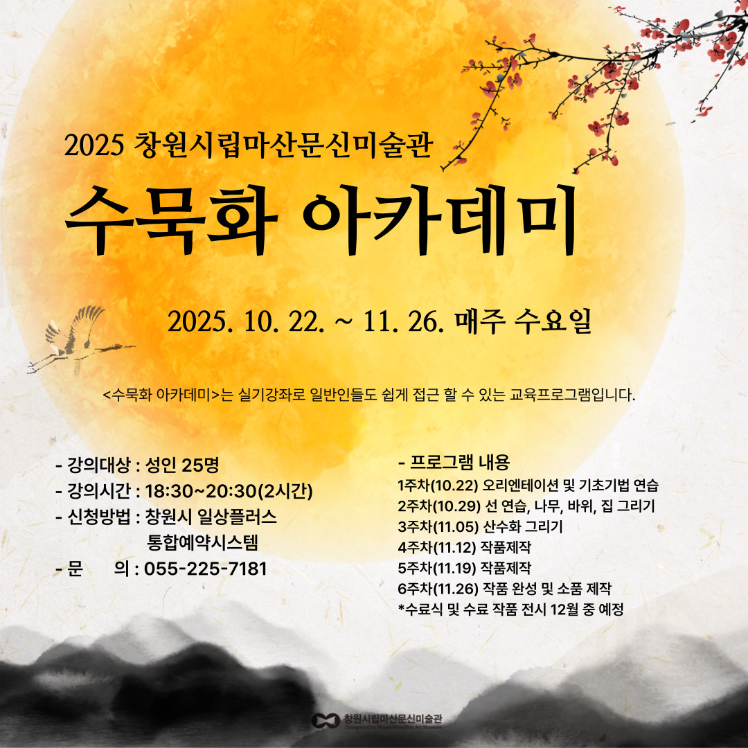 ★ ★ 일상플러스 통합예약시스템 사용이 원활하지 않을시, 미술관으로 전화(055-225-7181) 부탁드립니다.★ 문신미술관 '최성숙'명예관장이 직접 강의하는 실기 강좌로 미술에 관심있는 성인들을 대상으로 기초부터 단계적인 학습 방법을 시도함으로써 일반인들도 쉽게 접근할 수 있는 교육프로그램입니다. ★ 본 프로그램은 6주차 프로그램으로 신청하시는 분께서는 일정에 유의하시기 바랍니다.★ ● 프로그램 개요 -일 시 : 2025. 10. 22. ~ 11. 26. 매주 수요일, 18:30~20:30 -대 상 : 일반 성인 25명 (ID당 1명 신청) -강 사 : 최성숙(문신미술관 명예관장) -장 소 : 문신미술관 교육실 ● 세부내용 -1주차(10.22.수) : 오리엔테이션, 기초기법(연필 잡는 법, 사용법, 선 연습) -2주차(10.29.수) : 선 연습, 나무・바위・집 그리기 -3주차(11.05.수) : 산수화 그리기(집, 바위 사이의 물 그리기) -4주차(11.12.수) : 작품 제작 -5주차(11.19.수) : 작품 제작 -6주차(11.26.수) : 작품 완성, 소품 제작 *12월 중 : 수료식 및 수료 작품 전시 ● 신청방법 -신청기간 : 2025. 09. 23.(화) 09:00 ~ 마감시까지 *선착순 모집 -신청방법 : 창원시 일상플러스 통합예약시스템을 통한 사전 신청 -참가비용 : 무 료 *재료비 개인 부담* -교육문의 : 055-225-7181 ● 유의사항 -이 수업은 6주차 프로그램입니다. -예약시 ID당 1명 예약가능합니다. -교육 참여가 어려울 경우 다른 참여자를 위해 1주차 시작 전 취소 처리 바랍니다. -프로그램 운영 시 촬영한 사진은 미술관 홍보 및 연구, 발간자료 등에 활용될 수 있으며, 신청예약과 동시에 위 내용을 동의했음으로 간주합니다. -미술관 상황에 따라 프로그램 내용 및 일시가 변경될 수 있습니다. (당일 취소 불가/ 통보 없이 무단 불참시 추후 미술관 교육프로그램 참여에 불이익) |